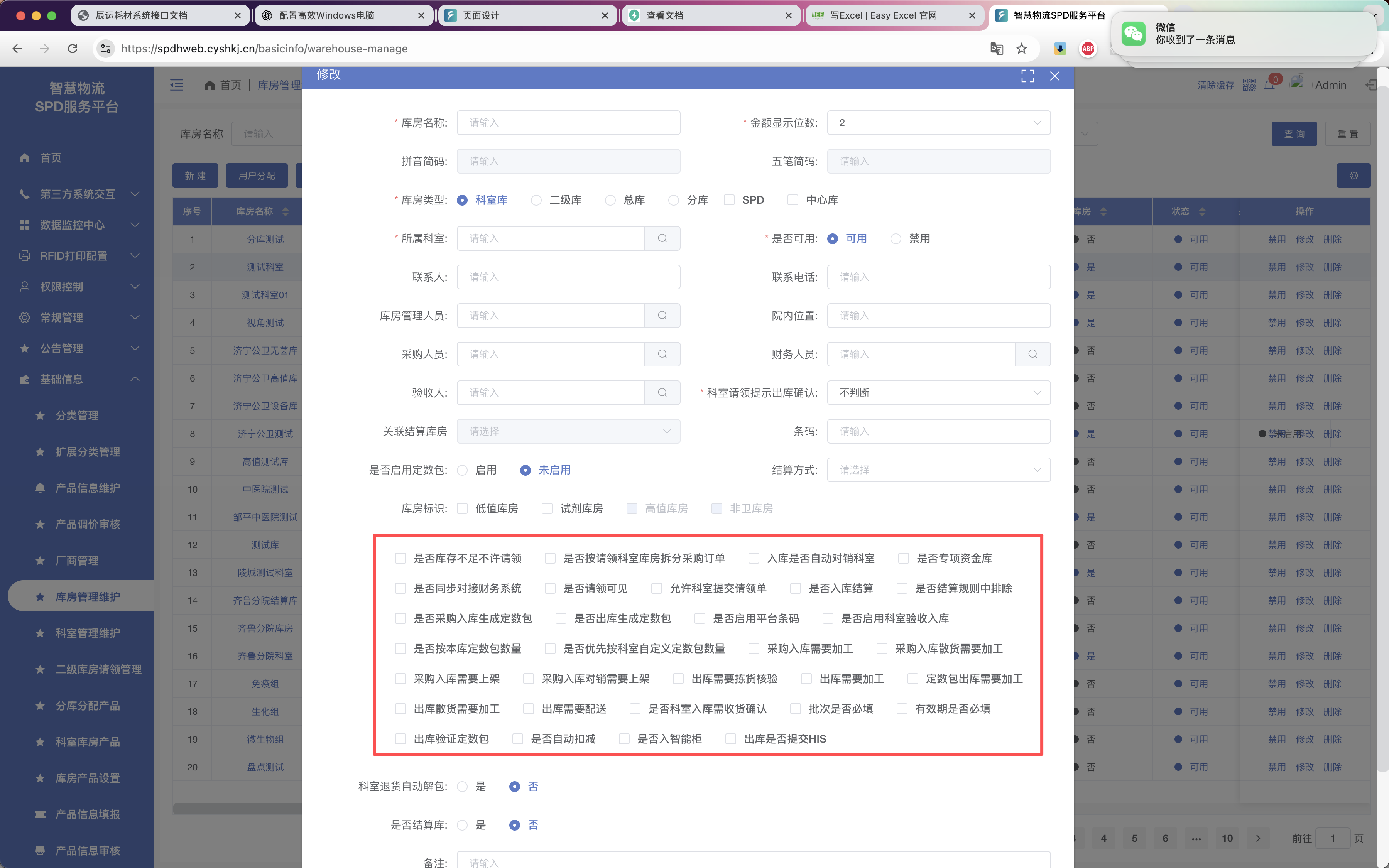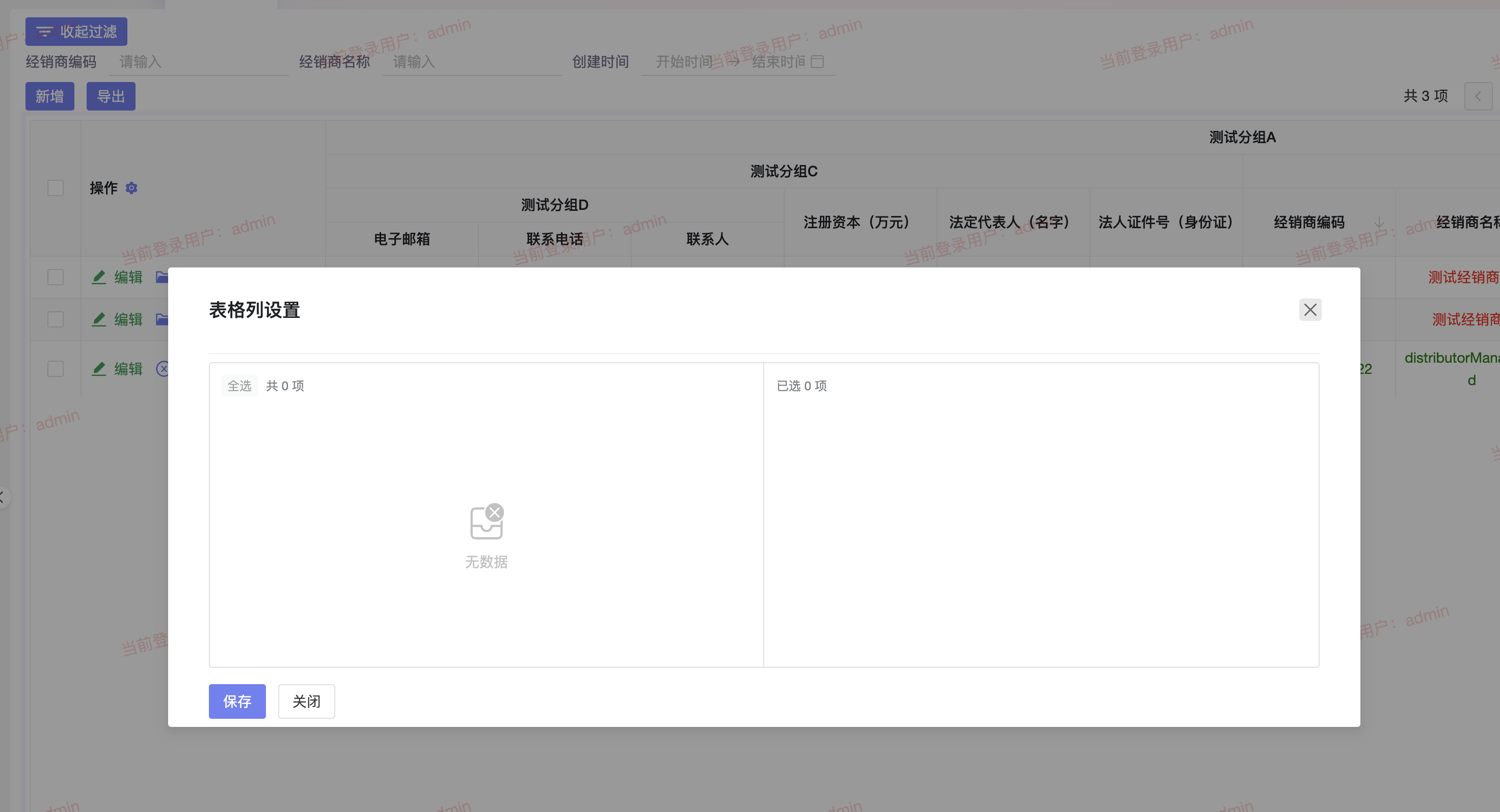- 去掉该选项 - 点击登录,调用`user/getHospital`接口,该接口会返回两种类型 - 如果是`数组`, 则选择对应的院区后拿着`院区ID` `登录账号` `登录密码` 在去掉`user/toLogin` - 如果是`字符串`,说明这个用户只有一个院区,就直接登录 UI参考 --- ### 页面设计 #### 显示问题  页面设计,这里的如果配置有内容,左右切换时这个红点会在固定列上边,应该不显示才对 涉及范围 - `显示列` `搜索项` `按钮配置` #### 显示列 - 显示列新增,添加类型,列类型- `分组`,即 col_type = group - 显示列-分组标识,改为下方这种 这里说明一下 首次请求显示列的接口后 前端需要构建一个数据(后续叫 `分组行`),将col_type = group 的行的col_code和col_name存储一下 如果新增了一行,col_type = group, 要加到`分组行`的数据中,删除时也要删除 当然,`当前行不能选择当前行 ` 这里保存的时候,传值传入的是对应父级的Code码 #### 按钮-导出配置 * 默认有导出当前页 和 导出全部 两个 每个导出,都可以选择对应的导出模板,默认为默认,还可以选择导出模板里面的模板 这里最终在页面呈现出来的数据是 ```"exportProps": "mode": "", // 默认为default,模板的为template "templateCode": "", 仅mode = template时传入 "templateParams": {}, 预留 "header": [] 导出的表头信息,仅 mode = Default时生效,更多说明见下面 }, ``` > 关于header的格式,这里以 经销商 管理 为例 ``` "exportProps": { "mode": "default", "headerList": [ { "groupCode": "groupCodeA", "fields": [ { "groupCode": "groupCodeB", "fields": [ "name", "code", "abbr" ] }, { "groupCode": "groupCodeC", "fields": [ { "groupCode": "groupCodeD", "fields": [ "contact_person", "email", "mobile" ] } ] } ] }, "status" ] } ``` 如果当前表格显示列,无多级表头,则传入[a,v,b,c,d] 多级表头,按照下面的方式传入 ``` { "groupCode": "groupCodeC", "fields": [ { "groupCode": "groupCodeD", "fields": [ "contact_person", "email", "mobile" ] } ] } ``` 混合,既有多级、又有单级 ``` [ { "groupCode": "groupCodeA", "fields": [ { "groupCode": "groupCodeB", "fields": [ "name", "code", "abbr" ] } ] }, "status" ] ``` --- ### 实际业务页面 #### 表格显示列  这里完善一下,实现这个功能 ### 基础信息 #### 库房管理 * 完善新增、编辑、删除、禁用、启用 * 新增一个按钮,叫 库房属性配置 的按钮,在顶部 这个按钮,打开是一个页面,里面是一些表单配置项,相当于把之前这里的配置抽出来了  相关接口在接口文档中 获取: `/warehouse/getById` 保存: `/warehouse/setProperty` * 新增一个 `分配用户` 按钮,暂留 #### 科室管理 * 新增一个 `分配用户` 按钮,暂留 #### 注册证管理 * 新增`新增` `编辑`的前端页面 #### 定数包管理 * 新增`新增` `编辑`的前端页面 接口在 `基础信息模块/定数包配置管理/add_5`